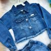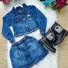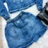 CONJUNTO JEANS COMPOSTO POR JAQUETA/CASACO JEANS E SAIA JEANS