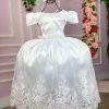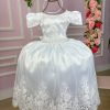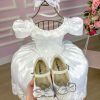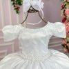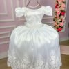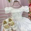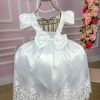 Confeccionado em tecido misto possui forro em poliéster e algodão para não incomodar a criança e proporcionando um caimento incrível e sofisticado, possui gola redonda, comprimento médio, mangas curtas, apliques de perolás, contém, também, elástico nas costas para melhor ajuste, acabamento com lindo laço na parte posterior do vestido completa o look dos sonhos!
