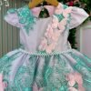 Vestido Marie Jardim Encantado Luxo Rosa e Verde Tiffany